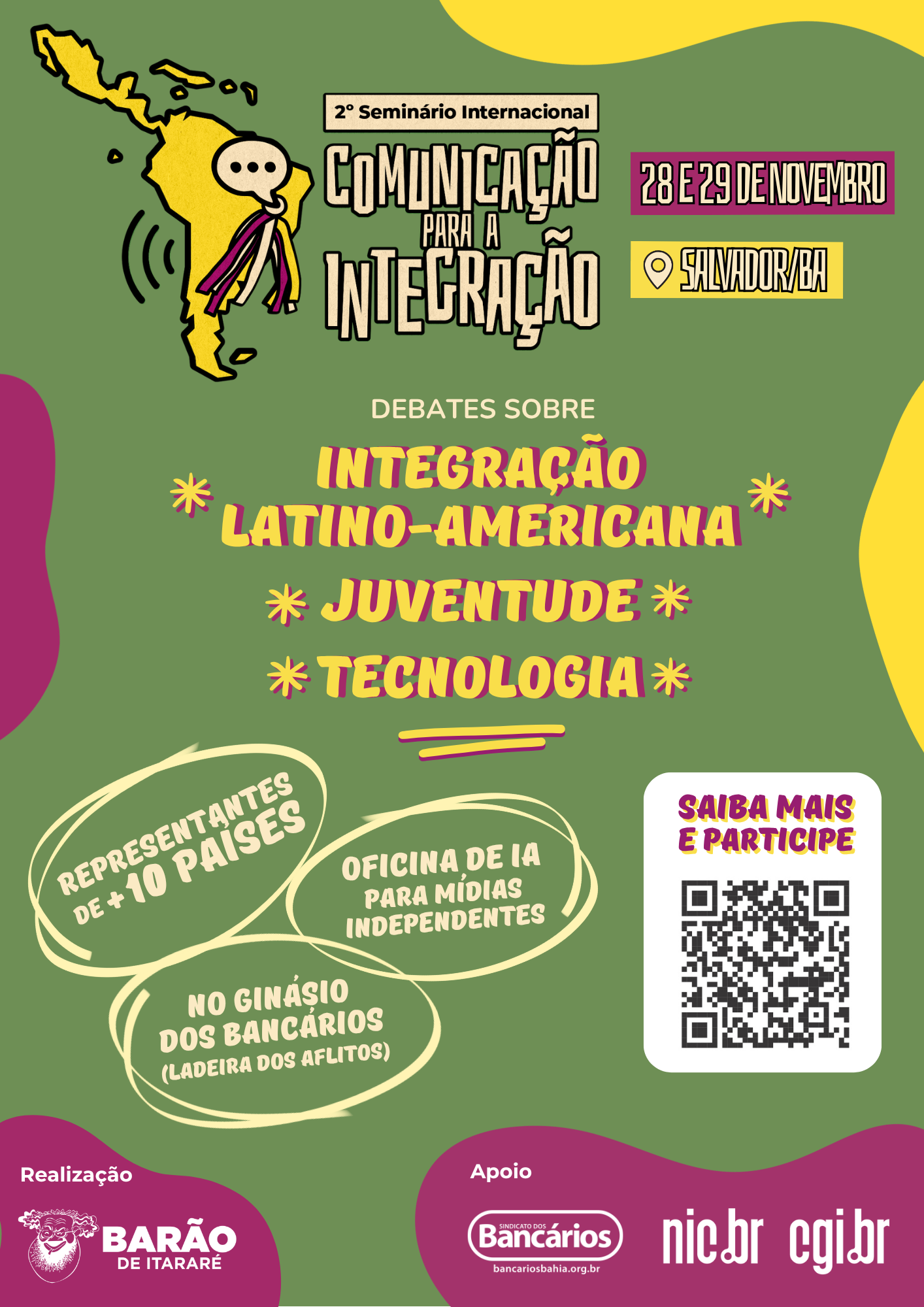 Durante os dias 28 e 29 de novembro, Salvador/BA se tornará a capital da integração latino-americana. O Ginásio dos Bancários (na Ladeira dos Aflitos) sediará o evento, que conta com apoio do Núcleo de Informação e Coordenação do Ponto BR (NIC.br), através do Comitê Gestor da Internet no Brasil (CGI.br), além do Sindicato dos Bancários da Bahia.