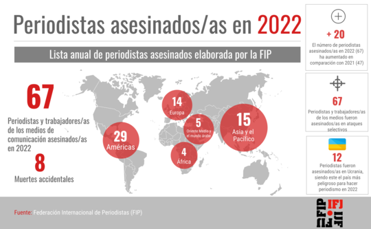 Na véspera do Dia dos Direitos Humanos, celebrado em 10 de dezembro, a FIJ divulgou os últimos números registrando 67 assassinatos de jornalistas e trabalhadores da mídia no cumprimento do dever em 2022, contra 47 no ano passado, o que representa uma reversão da tendência de queda registrada nos últimos anos. A votação da Convenção da FIJ sobre a Segurança dos Jornalistas pela Assembleia Geral da ONU tornou-se urgente.