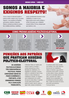 Nove centrais sindicais estão distribuindo um folheto sobre assédio ou coação eleitoral, explicando que a prática é um crime previsto na legislação brasileira, e dando informações sobre como e onde os trabalhadores e trabalhadoras podem denunciar.
