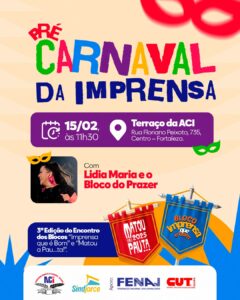 No Ceará, o Pré-Carnaval da Imprensa acontece no dia 15 de fevereiro (sábado), a partir das 11h30, no Terraço da ACI (Associação Cearense de Imprensa), em Fortaleza, provendo a terceira edição do encontro dos blocos “Imprensa que é bom” e “Mautou a pau…ta!”, este último do Sindicato dos Jornalistas do Ceará (Sindjorce). O evento reunirá jornalistas, comunicadores e foliões para um dia de festa, com muito axé e alegria. A atração principal será a cantora Lídia Maria e o Bloco do Prazer, garantindo a animação dos participantes. Além disso, haverá preços promocionais nas bebidas, incentivando a confraternização entre os profissionais da área.