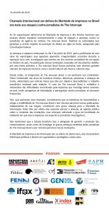 Notas OficiaisNotícias Chamado Internacional em defesa da liberdade de imprensa no Brasil em meio aos ataques contra jornalistas do The Intercept 31 de julho de 2019 980 FacebookTwitterPinterestWhatsAppLinkedin