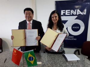 A Federação Nacional dos Jornalistas (FENAJ) e a Associação de Jornalistas de Toda a China (AJTC) assinaram ontem, 2, um acordo de cooperação que prevê intercâmbio de informações e ações conjuntas das duas entidades, além da recepção recíproca de jornalistas dos dois países. O acordo de cooperação foi assinado pela presidenta da FENAJ, Maria José Braga, e pelo secretário-executivo da AJTC, Sr. Zhang Baixin.