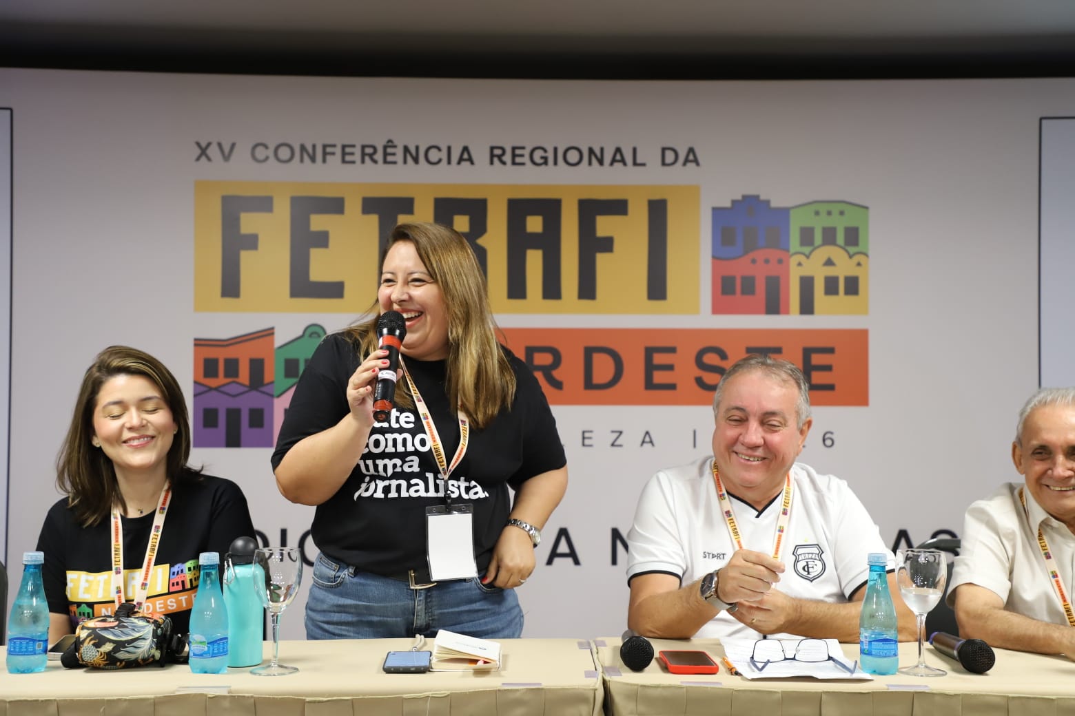 A Federação Nacional dos Jornalistas (FENAJ) participou, no domingo (26/04), da 15ª Conferência Regional da Federação dos Trabalhadores(as) do Ramo Financeiro no Nordeste (FETRAFI/NE), em Fortaleza (CE). O painel foi sobre os desafios da comunicação no cenário contemporâneo, com foco na mobilização sindical, no combate à desinformação e na disputa de narrativas na sociedade digital. A atividade reuniu 140 elegados(as), epresentantes do movimento sindical dos bancários e especialistas para discutir o impacto das plataformas digitais na organização da classe trabalhadora.