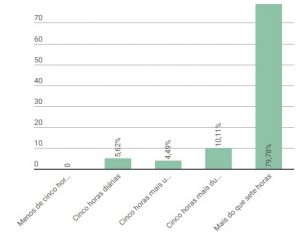 Outros 10% afirmaram trabalhar sete horas; 5,62% dizem cumprir expediente de cinco horas diárias e 4,49% trabalham seis horas por dia. A legislação prevê jornada de trabalho diária de cinco horas para jornalistas, com possibilidade de extensão por,