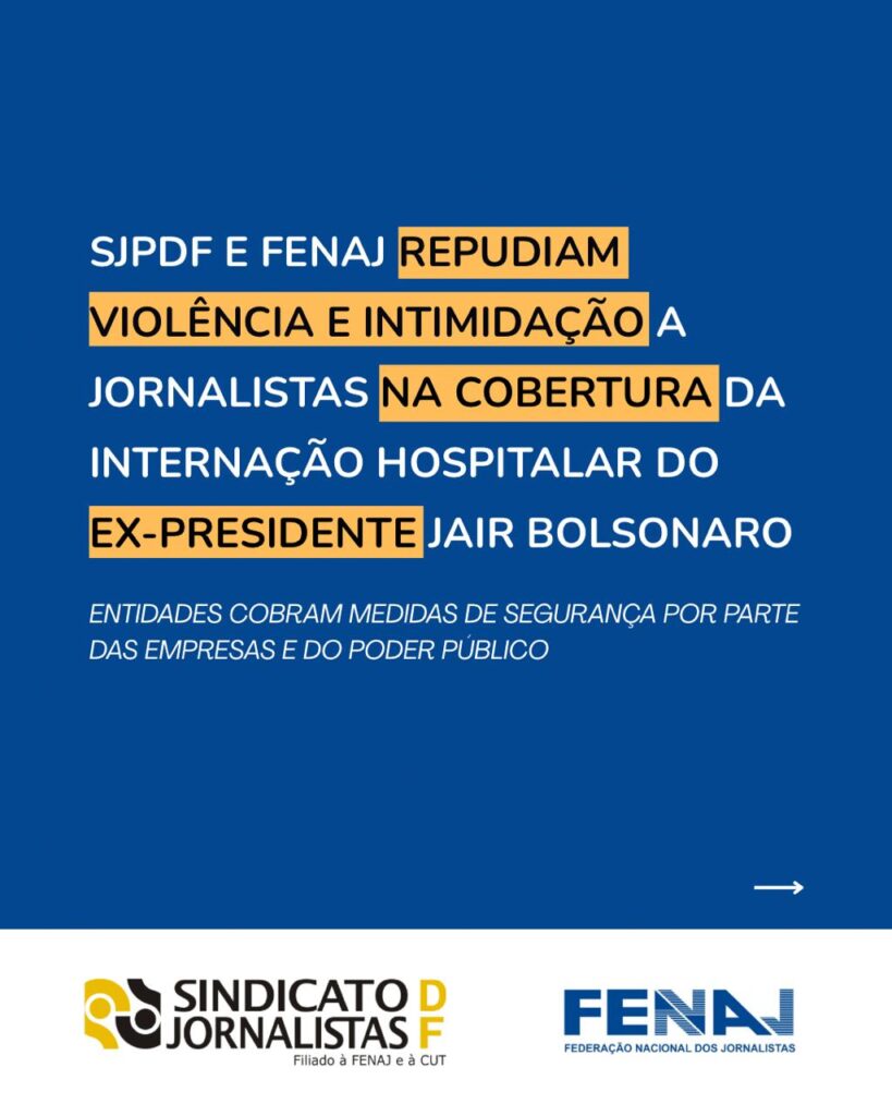 O Sindicato dos Jornalistas Profissionais do Distrito Federal (SJPDF) e a Federação Nacional de Jornalistas (FENAJ) vêm a público manifestar seu mais profundo repúdio aos graves episódios de hostilidade, violência e intimidação sofridos por profissionais de imprensa que realizam a cobertura da internação do ex-presidente Jair Bolsonaro, nesta sexta-feira (13), no hospital DF Star, em Brasília.