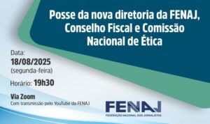A nova diretoria da Federação Nacional dos Jornalistas (FENAJ) tomará posse no próximo dia 18 de agosto de 2025 (segunda-feira), às 19h30, em cerimônia realizada de forma virtual, com transmissão ao vivo pelo canal da FENAJ no YouTube. Na mesma ocasião, também serão empossados os novos membros do Conselho Fiscal e da Comissão Nacional de Ética.