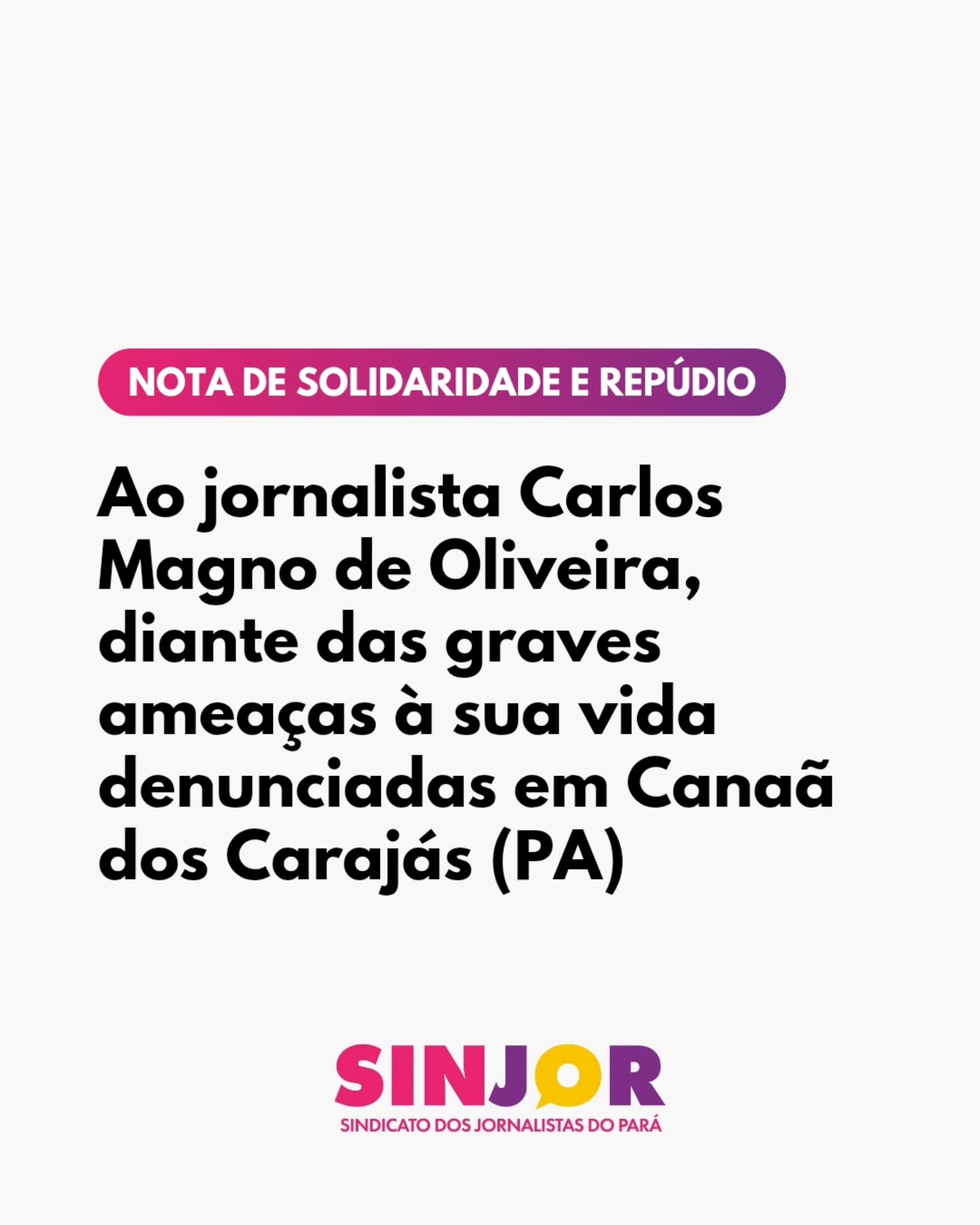 O Sindicato de Jornalistas no Estado do Pará (SINJOR-PA) manifesta sua mais veemente solidariedade ao jornalista Carlos Magno de Oliveira, diante das graves ameaças à sua vida denunciadas em Canaã dos Carajás (PA)