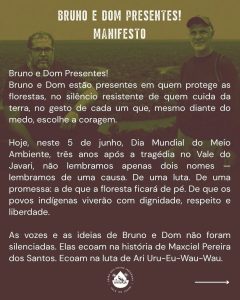Bruno e Dom estão presentes em cada palavra livre, em cada reportagem corajosa, em cada ato de resistência, em cada defesa da democracia, dos direitos humanos e da liberdade de imprensa.