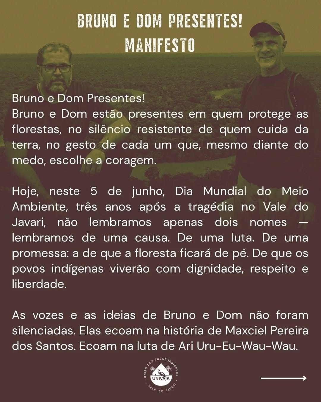 As vozes e as ideias de Bruno e Dom não foram silenciadas. Elas ecoam na história de Maxciel Pereira dos Santos. Ecoam na luta de Ari Uru-Eu-Wau-Wau. Na fé e bravura de Dorothy Stang. Na memória viva de Emyra Wajãpi, Mãe Bernadete e Chico Mendes e tantos outros que morreram lutando.