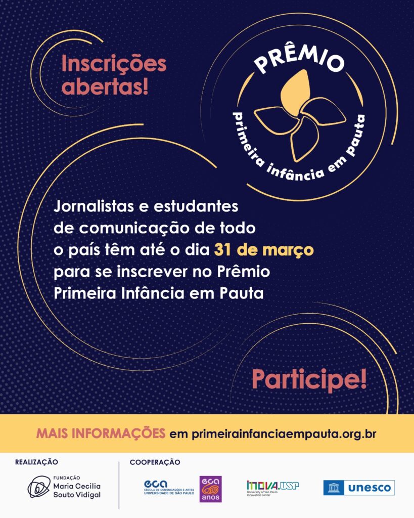 Toda história começa na primeira infância. E esse assunto merece ser narrado com profundidade e responsabilidade. Para estimular e reconhecer a cobertura jornalística brasileira com pautas voltadas ao começo da vida em suas múltiplas dimensões, a Fundação Maria Cecilia Souto Vidigal lança o Prêmio Primeira Infância em Pauta. Com inscrições abertas a partir de hoje, 26 de fevereiro, a iniciativa é realizada em cooperação com a Organização das Nações Unidas para Educação, Ciência e Cultura (UNESCO) e a Escola de Comunicações e Artes da Universidade de São Paulo (ECA-USP) e o InovaUSP.