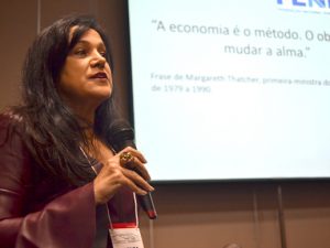 Como presidenta da FENAJ, lembrou da grande capilaridade e poder de influência da mídia, criticando manobras políticas de grandes conglomerados que operam por meio de uma forte rede de afiliados. A grande imprensa, pontuou ela, “é elitista e partidarista” e foi agente de um movimento de criminalização dos movimentos sociais e ataque às entidades sindicais nos últimos tempos, culminando no golpe. Essas entidades, completou a sindicalista, atuaram em um grande movimento de silenciamento da classe trabalhadora, que também contou com a eliminação de direitos básicos como estratégia para tirar da população uma condição de reflexão.