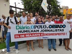 A indignação dos operários da notícia foi demonstrada na última segunda-feira (18/02), em paralisação realizada junto à redação do Jornal O Povo. O protesto, que contou com discursos em solidariedade ao jornalista Kaio Cézar, que pediu demissão no sábado (16/02), ao vivo, durante o encerramento do Globo Esporte, na TV Verdes Mares, chamou a atenção de quem passava em frente ao periódico, na Avenida Aguanambi. A atividade teve, ainda, fala do presidente do Sindicato dos Gráficos do Ceará (Sintigrace), Rogério Andrade. A categoria também está tendo seu direito ao auxílio-creche descumprindo pelos donos do jornal Diário do Nordeste.