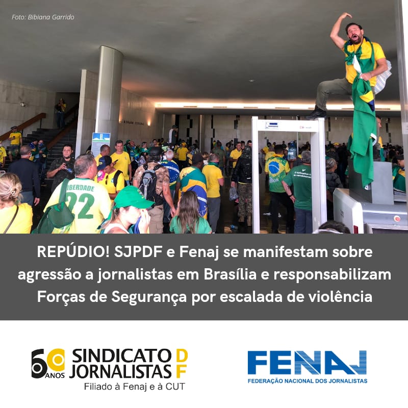 O Sindicato dos Jornalistas Profissionais do Distrito Federal e a Federação Nacional de Jornalistas manifestam seu mais profundo repúdio aos atos golpistas e terroristas ocorridos neste domingo na Esplanada dos Ministérios e à violência contra profissionais da imprensa, impedidos de realizar seu trabalho com segurança. Ao mesmo tempo, o Sindicato e a FENAJ se solidarizam com os e as colegas feridos/das durante o exercício da profissão. Já temos informação de ao menos doze colegas atacados, de diferentes veículos (veja o fim da nota).