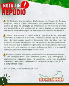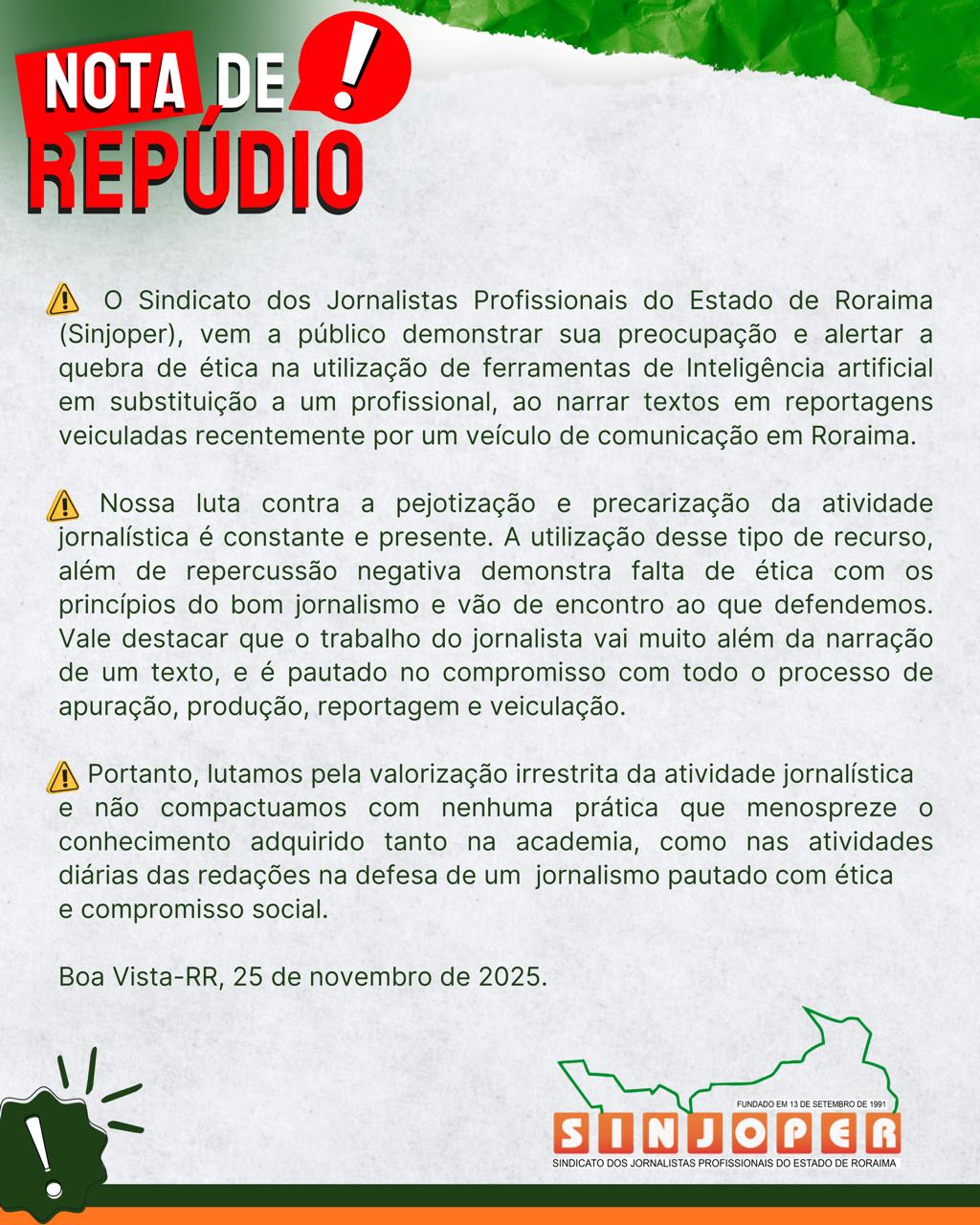 O Sindicato dos Jornalistas Profissionais do Estado de Roraima (Sinjoper) vem a público demonstrar sua preocupação e alertar a quebra de ética na utilização de ferramentas de inteligência artificial em substituição a um profissional, ao narrar textos em reportagens veiculadas recentemente por um veículo de comunicação em Roraima.